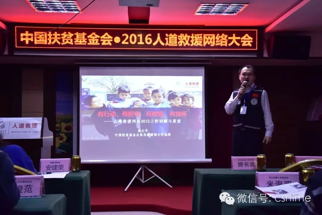 在人道救援网络大会上,发起单位中国扶贫基金会秘书长助理安建荣向与会嘉宾分享了人道救援网络2015年取得的成绩和进步。